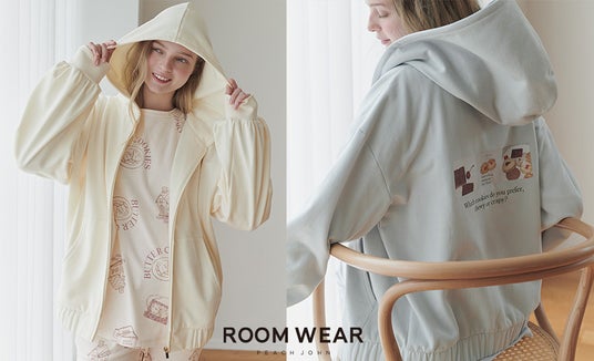 スウェットパジャマと同素材の単品スウェットパーカーが登場。クッキー柄がアクセントの、大人キュートなスウェットパーカー。