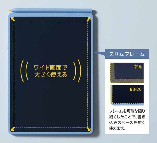 「ブギーボード」BB-20は、機能とデザイン性をより高めた約8.5インチモデルです。フレームを可能な限り細くし、消去ボタンを表面ではなく側面に設計したことで、書き込みスペースを広く使えます。
