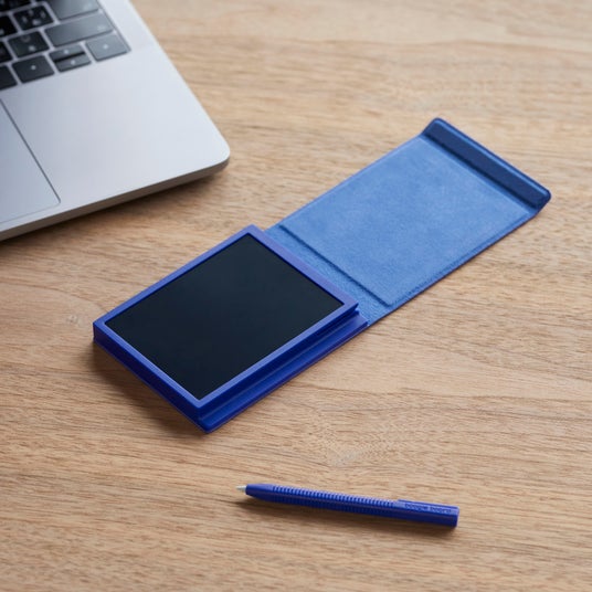「ブギーボード」BB-21は、胸ポケットにも収まるサイズ感でありながら、上質な風合いの布製カバーが付いた高級文具のようなデザインのモデルです。カバーは画面を覆う一体型で、持ち運びの際にカバンやポケット内で液晶への不用意な書き込みを防ぐことができます。