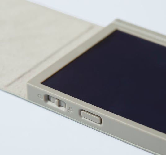 「画面を保護するカバーや蓋がほしい」というお客さまからのご要望にお応えし、本体一体型のカバーを採用しました。上質な風合いの布製カバーはアオ、クロ、キャメル、グレーの4色展開で、高級文具のようなデザインのため、プレゼントにもおすすめです。