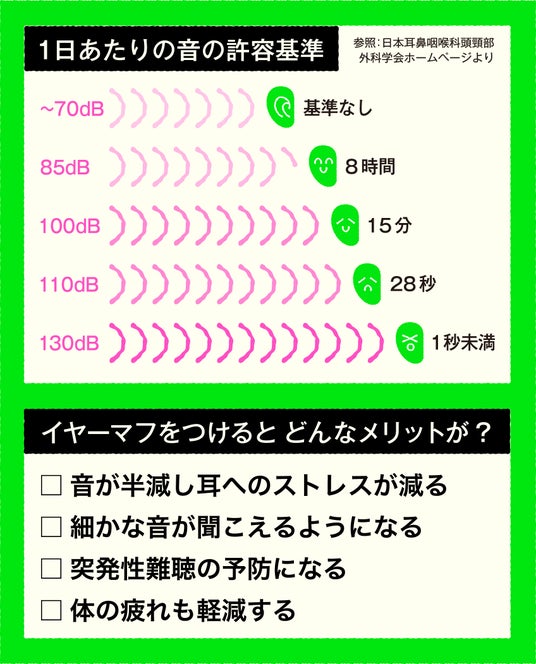 どのくらいの音量を、どのくらいの時間聴き続けていいかを知っていれば、対策の仕方も変わってくるはずです。まずはデータを見て、耳の許容値を知ることが大切です。