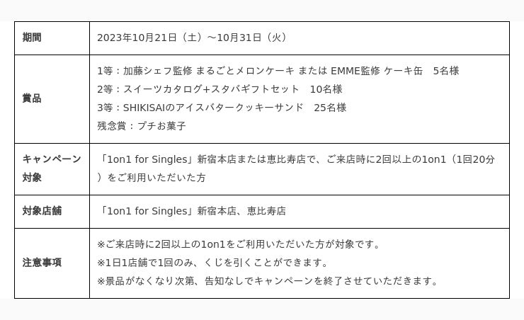 2023年10月21日(土)~10月31日(火)の期間中に「1on1 for Singles」新宿本店または恵比寿店で、1来店2回以上の1on1をご利用いただいた方に抽選で、加藤シェフ監修・まるごとメロンケーキや表参道の人気ワインバーEMME監修・ケーキ缶、スイーツカタログなどをプレゼントいたします。