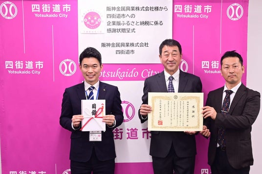 阪神金属興業株式会社様(本店所在地:大阪府高槻市唐崎北2丁目15番1号)から企業版ふるさと納税制度を活用して、いただいた寄附に対する感謝状贈呈式を行いました。