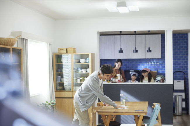 家族と過ごす団らんの時間も、ひとりで過ごす自由な時間も。ふだんの家事や在宅ワークに気分が乗らない時だって。天井から降り注ぐ光と音を組み合わせて、くらしのシーンをさまざまに演出。テレビとつないで、スマホで好きな音楽をかけて、気分を盛り上げることができます。