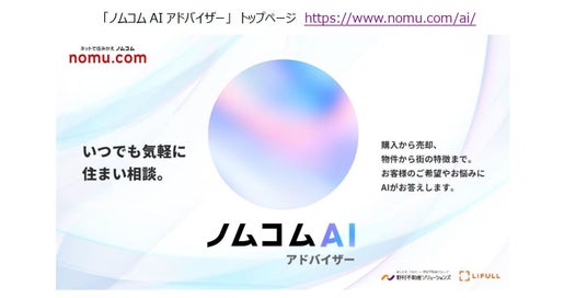 野村不動産ソリューションズ株式会社(本社:東京都新宿区/代表取締役社長:前田 研一、以下「当社」)は、株式会社 LIFULL(本社:東京都千代田区/代表取締役社長執行役員:伊東祐司、以下「LIFULL」)と、生成AI技術を活用した自然言語でのチャット型コミュニケーションの相談AIサービスとして「ノムコムAIアドバイザー」を共同開発したことをお知らせいたします。また、不動産売買を検討するお客様に向けた新しいサービスとして、当社が運営する不動産情報サイト「ノムコム」(https://www.nomu.com/)にて、7月30日より提供を開始いたしました。