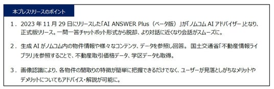当社は、2016年から提供している「住まいのAI ANSWER」※1から発展させ、生成AI技術を活用した自然言語でのチャット型コミュニケーションの相談AIサービス「AI ANSWER Plus(ベータ版)」※2を昨年リリースしました。しかしながら、これまでは一問一答形式に近いやり取りに留まるなどの機能となっていました。そのため今回、ユーザーの条件等のヒアリングからAIによる提案までを可能としました。回答できる「アンサー」から提案できる「アドバイザー」として、「ノムコムAIアドバイザー」に名称を変更、進化した正式版をリリースいたします。