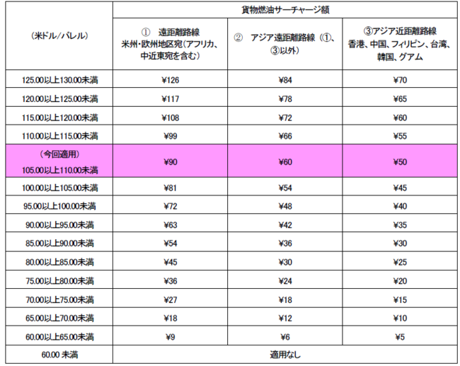 貨物燃油サーチャージテーブル (表示価格は貨物1kgあたり)