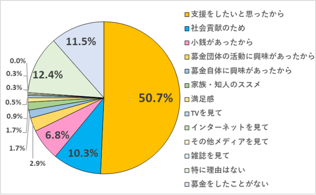 「なぜ、募金をしましたか?」という質問に対しては、「支援をしたいと思ったから」が約半数の50.7%でトップ。次いで、「社会貢献のため」が10.3%で2番目、「小銭があったから」が6.8%で3番目となりました。