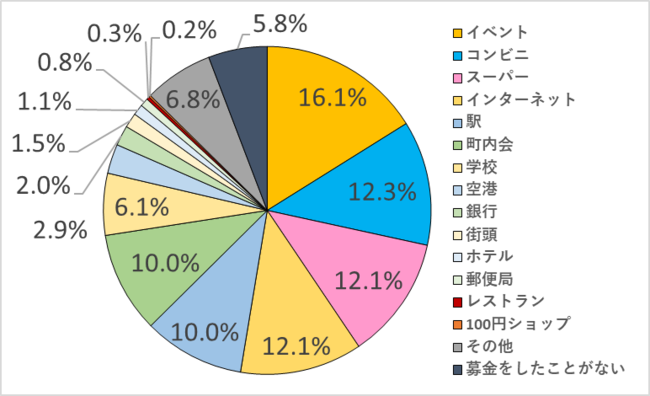 「どこで募金をしましたか?」という質問に対し、「イベント」が16.1%とトップになりました。次いで、「コンビニ」が12.3%、「スーパー」が12.1%となりました。