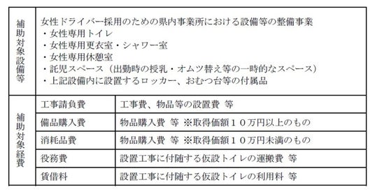 ※ 補助対象事業となる各設備の設置数は、女性ドライバーの採用計画人数が上限となります。