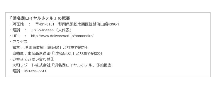 当ホテルは、浜名湖畔に建ち、湖を一望できるリゾートホテルです。2010年7月に和食レストラン「遠州灘」・オリエンタルスイートルームをリニューアルし、2012年7月にはエントランスロビーと大浴場をリノベーションしました。また、2014年3月には、スパ温浴施設「ONSEN La Coon(オンセン・ラ・クーン)」を完成させ、お客さまにご利用いただいております。