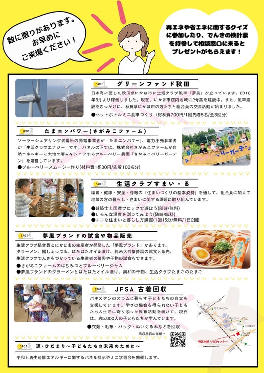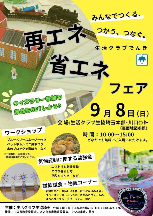 生活クラブ 生活協同組合埼玉(本部:埼玉県川口市)は、地球加熱化やCO2削減を自分事としてとらえ、脱原発・再生可能エネルギーを推進し、持続可能な地域社会づくりをすすめていくため、エネルギーやでんきのことについて、遊びやワークショップ、体験を通して、学んで考え、行動するイベントを開催します。