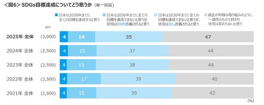 SDGs活動への考えは、「過去の同様な取り組みのように、一過性のもので終わる」が47%と半数に迫っている。「目標を達成はできないと思うが状況は少し改善されると思う」は35%であった。<図6>