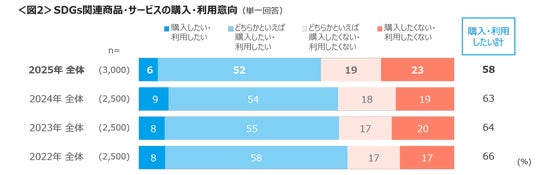 関連商品の購入や利用意向は58%で、昨年より5ptの減少。2022年をピークに減少傾向は続いており、今回は過去4年間での最低値となった。<図2>