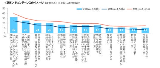 ジェンダーレスのイメージは「男らしさ、女らしさといった枠にとらわれず、個人が自分らしくいられること」が32%、「男は仕事、女は家庭という固定的な性別役割分担が解消すること」「男性も女性も平等に家事・育児・介護などを分担すること」「LGBTQ+など多様な性が、社会全体で認知され尊重されること」が20%台。上位の項目すべてにおいて、男性より女性の方が5~15pt強いイメージを持っている結果となった。<図5>