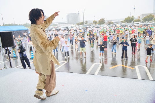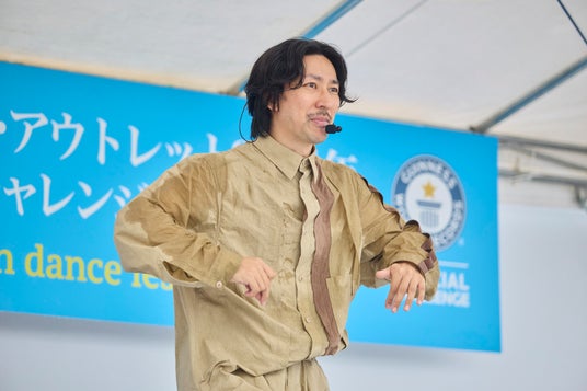 当日は、イベントが始まると徐々に天気が崩れ出し、時折激しい土砂降りに。そんな中でも、参加者は30分以上のレッスンを受けた後、3分以上にわたり一斉にチャールストンダンスを踊ることで、見事ギネス世界記録(TM)を達成しました。イベント内では「教えて!TAKAHIROさん質問コーナー」も実施し、参加者から募集したダンスのお悩みや自身のダンス経験に関する質問に、TAKAHIROさんならではの軽快なトークで答える場面などが見受けられ、来場者は大雨の中でも笑顔でギネス世界記録(TM)達成の喜びを分かち合いながらイベントを楽しみました。