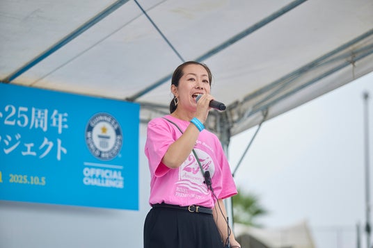 TAKAHIROさんは過去に自身が達成したギネス世界記録「20mのムーンウォークで最速(The fastest 20 m moonwalk)」の保持者でもあるため、参加者の目の前で実際に少しだけムーンウォークも披露。また、意気込みとして「雨は降ってるけど、みんなの表情が明るい!ギネスがどんどん近づいてきたぞー!とにかく、今を楽しみましょう!」とTAKAHIROさんらしい言葉で参加者を盛り上げました。