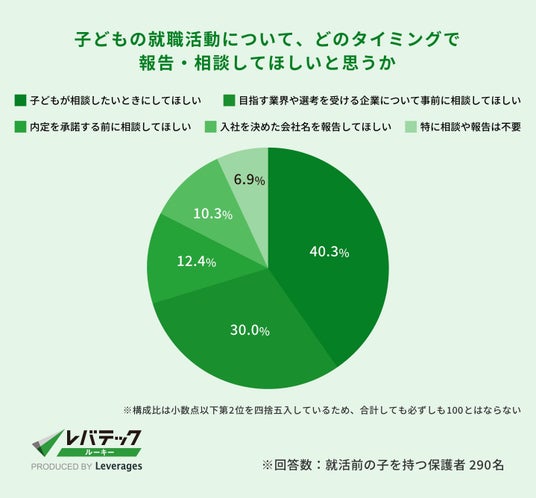 一方、就職活動を控える学生に対する「どのタイミングで保護者に報告・相談したいと思いますか」という質問では、「入社を決めたあとに報告したい」「特に相談や報告はしたくない」と回答した学生は合わせて24.3%という結果になりました。約4人に1人の学生は保護者に相談することなく、自分で入社する企業を決めることを希望しているようです。