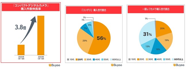 「カメラ・光学機器」カテゴリでは、コンパクトデジタルカメラに特徴的な動きがみられ、2000年代に流行した機種の中古アイテムが人気を集めました。クリア過ぎない画質がレトロであると20代の間で人気を集め、昨対で3.8倍に伸長しています。一眼レフカメラの購買層が60代中心で31%を占めるのに対し、コンパクトデジタルカメラは購買ユーザーの56%が20代となっており、Z世代人気が現れました。