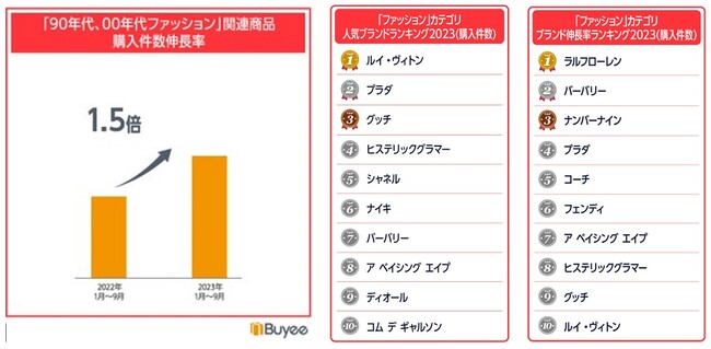 ファッションジャンルでは販売名に「90’s」「00’s」や「90年代」などを含む商品が1.5倍に伸長しました。また人気ブランド、伸長ブランドランキングでは、90年代~2000年代に流行したブランドがランクインしています。「ヒステリックグラマー」や「ア ベイシング エイプ」等のドメスティックブランドのほか、「ラルフローレン」や「バーバリー」が伸長を見せています。