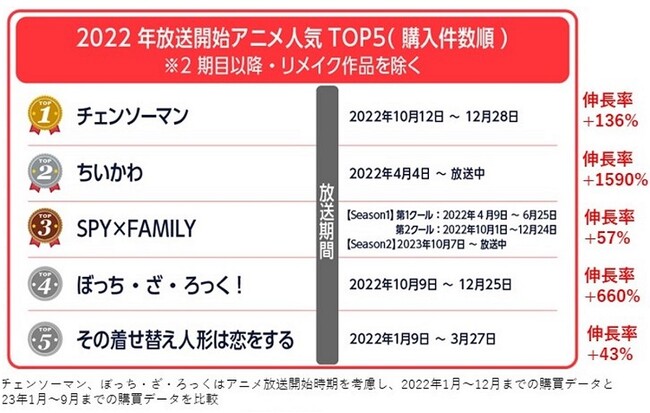 そこで今回は2022年に第1期の放送が始まったアニメ作品に絞った人気ランキングを紹介します。1位「チェンソーマン」、2位は「ちいかわ」、3位「SPY×FAMILY」、4位は「ぼっち・ざ・ろっく!」、5位は「その着せ替え人形は恋をする」です。特に「ちいかわ」が東アジアで爆発的な人気を見せています。これらの作品が10年、20年と愛されるロングテールコンテンツに成長するかもしれません。