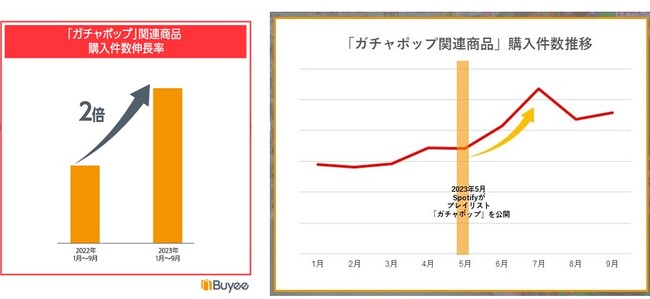 音楽ジャンルでは、2023年5月にSpotifyが公開したプレイリスト「ガチャポップ」にリストされたアーティストの関連商品が前年同期比で2倍に伸長しました。
