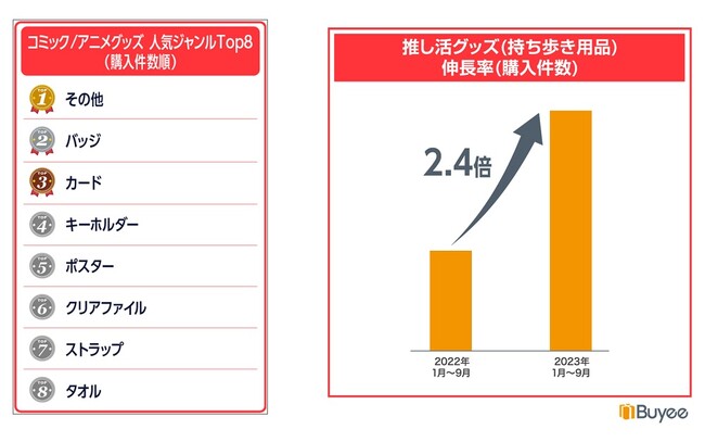 ンルをご紹介します。バッジ、カード、キーホルダーなど、一度に数種類が発売され、持ち運びやすいアイテムが並びました。1位のその他にはアクリル系商品やプライズ品などが含まれます。こうしたグッズを持ち運ぶための推し活グッズも購入件数が2.4倍に伸長しており、コンテンツのヒットにより、公式のグッズだけではなく、関連する商品にも需要が波及していることが分かります。