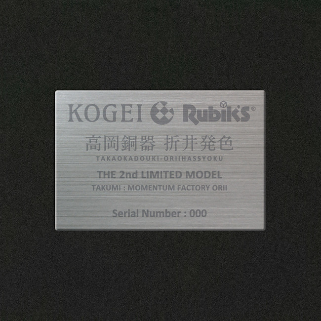 匠二弾『 工芸ルービックキューブ 高岡銅器 折井発色』は、富山県高岡市の伝統工芸「高岡銅器」の技術を進化させた「折井発色」色彩を表面のタイルに使用しました。 「折井発色」は、職人による手仕事により表面のムラや発色に同じものはない等、銅器着色の特色があり銅素材が持つ表情の深みを感じていただけます。