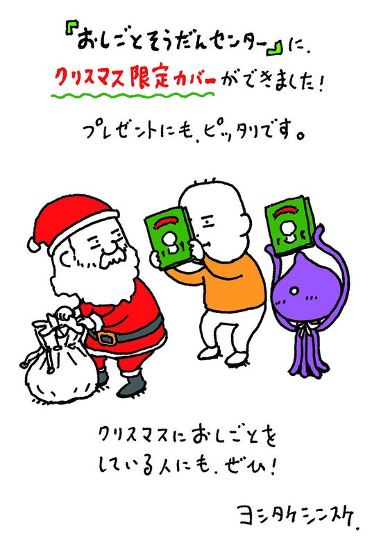 この「クリスマス限定新オビ版」の発売に向けて、著者のヨシタケさんから直筆のコメントイラストが到着しました。これからのホリデーシーズンに向けて、新バージョンの『おしごとそうだんセンター』に是非ご注目ください。