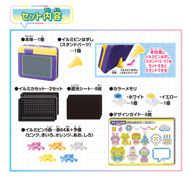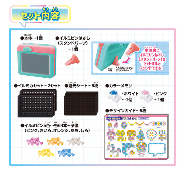 本商品は付属のデザインガイドを参考に5色のイルミピンをさしてイルミカセットを作ります。