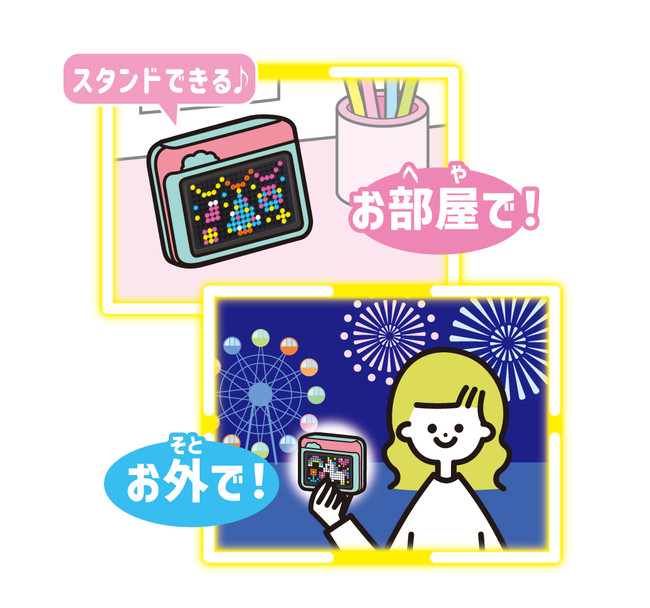 ドリームカラーにはホワイトメモリ・ピンクメモリ、ポップカラーにはホワイトメモリ・イエローメモリが入っています。また、スタンドパーツを取り付ければ本体をスタンドすることができ、ストラップを取り付けることもできます。 (ストラップは付属されていません)おうちでもお外でもイルミネーションを楽しめます。