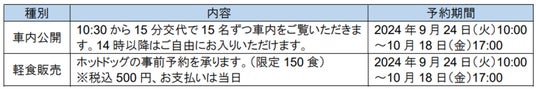 車内公開は10:30~14:00まで事前予約制とし、14時以降はご自由にお入りいただけます。