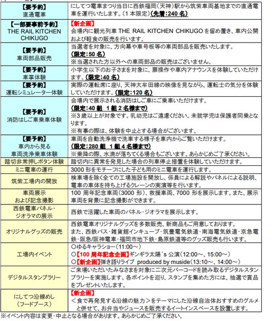29回目の開催、そして西鉄電車開業100周年となる本年は、例年人気の高い車両洗浄乗車体験、運転シミュレーター・車掌体験に加えて、100周年記念企画や新企画などを実施いたします。