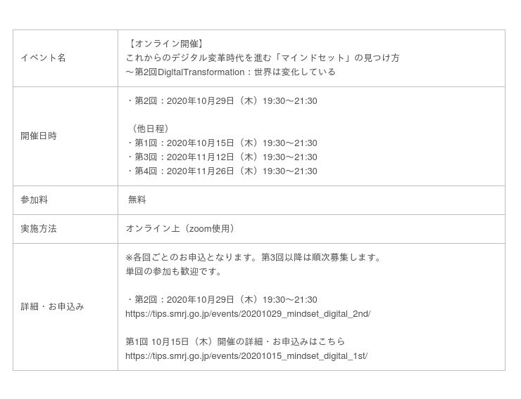 独立行政法人中小企業基盤整備機構(略称:中小機構、本部:東京都港区、理事長:豊永 厚志)創業・ベンチャー支援部 TIP*Sは、2020年10月29日に新しいアクションをしたい方へむけて、オンラインのワークショップ「これからのデジタル変革時代を進む「マインドセット」の見つけ方」(全4回・単回参加可能)の第2回を開催します。