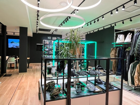 プラザアパレルやグッズは店内のアイランドスペースに展示。実際に手に取って確かめやすいレイアウトです。