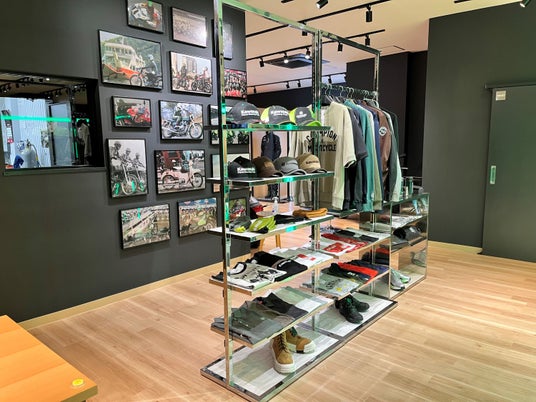 木目調のフロアと白い天井が織りなす明るい店内。モーターサイクルとプラザアパレルがゆったりと展示され、どなたでも楽しめる空間としています。