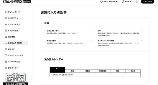 法改正カレンダーやお役立ち資料、契約業務に関する記事やイベント情報などが一覧となって確認できます。