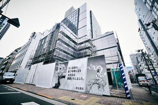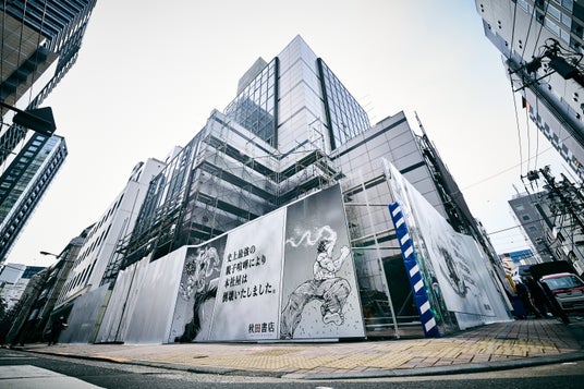 ●限定グラフィックが掲出された秋田書店本社屋工事現場