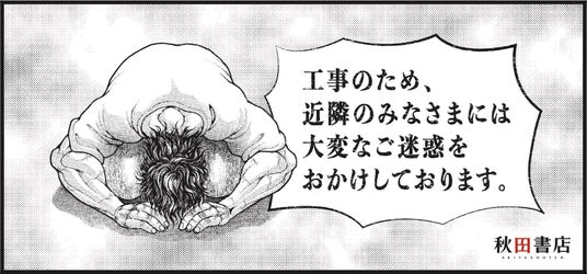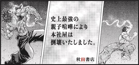 さらに、当社代表取締役社長の山口徳二は、「老朽化に伴い社屋を解体する運びとなりました。近隣の皆様には大変ご迷惑をおかけいたします。こっちの勝手な解釈ですが、この塀の向こうで範馬家の最強親子喧嘩が繰り広げられていたと想像してみてください。殺風景な工事現場も少しは楽しめる場所になるのでは。やはり勝手な解釈ですね。しばしの間、ご迷惑をおかけいたしますがお許しください」とコメントしています。そして、「刃牙」シリーズ初代担当であり、当社常務取締役の沢考史も、「新しいマンガ!新しい世界!!新しい時代!!!創り出すエネルギーが、刃牙と勇次郎の『地上最大の親子喧嘩』には噴出しています。その勢いで、まずは弊社旧社屋を大解体・超粉砕!秋田書店も新しい時代に生まれ変わります。近隣の皆様、誠に恐縮ですが、しばしのご寛恕お願いいたします……拝!」と、作品への熱い想いとともに語っています。