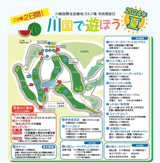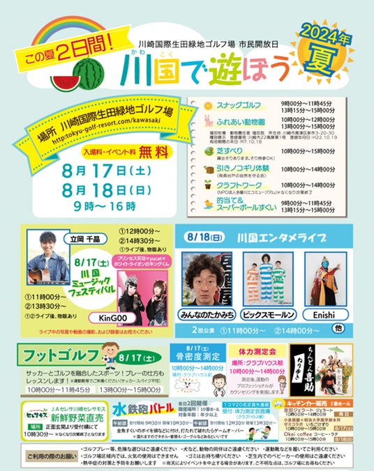 ポニーに乗ったりウサギやヒツジと触れ合える「ふれあい動物園」や、丸太切り体験ができる「引きノコギリ体験」、実際のゴルフコースを使った大人も子供も楽しめる「スナッグゴルフ」をはじめ、ミュージシャンによる「川国ミュージックフェスティバル」(17 日のみ)、お笑い芸人による「川国エンタメライブ」(18 日のみ)で盛り上げます。また売店やキッチンカーの出店もあり、冷たいジェラートやドリンクでクールダウンしながら、楽しい夏の日を満喫いただけます。