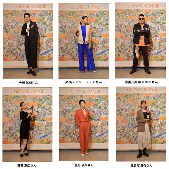 そしてイベントには、グレンモーレンジィ好きのセレブリティらが、今回のパッケージデザインがあしらわれたスカーフを身にまとい、お祝いに駆け付けました。「グレンモーレンジィ トーキョー」のパッケージデザインを彷彿とさせるような特徴的なオレンジ色の色彩で紡がれた会場の鮮やかな雰囲気と共に、テイスティングやビル博士と山口晃さんの対談などオレンジ色に包まれた空間を楽しみました。