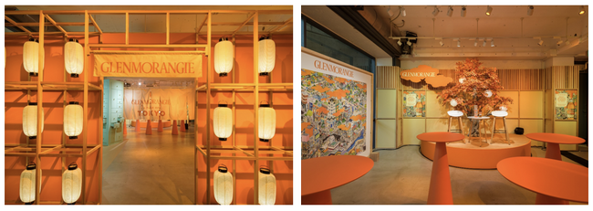 グレンモーレンジィの特徴であるオレンジ色の色彩を基調に、日本らしい暖簾や提灯、山口晃さんによるパッケージデザインの原画が展示され、「グレンモーレンジィ トーキョー」の世界観に包まれた会場。今回の限定商品の樽に使用した、ミズナラの木のオブジェがゲストを出迎えました。