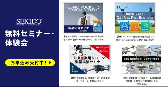 セキドでは、より多くの事業者の方にドローンを使った業務効率の改善を実現していただくため、業務用ドローンや関連ソリューションをご紹介する無料セミナーやイベントを定期的に開催しております。今後もオンラインや全国各地での開催を予定しておりますので、ご興味をお持ちのイベントにはぜひお気軽にご参加ください。