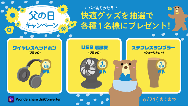 株式会社ワンダーシェアーソフトウェア(東京都千代田区、代表:呉太兵)の豊富な機能を搭載した動画ダウンロードソフトWondershare UniConverter(ユニコンバーター)の公式Twitterアカウントにて父の日キャンペーン実施中!キャンペーンに応募してプレゼントを当てよう!