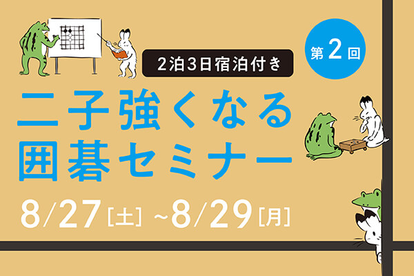 コロナ禍で人と人が向き合って直接対局する機会が減少する一方で、オンラインでの大会やレッスン、動画配信チャンネルが急速に増えるなど楽しみ方の選択肢が広がり、日本国内では約180万人*1が囲碁を楽しんでいるといわれます(*1:出展「レジャー白書2021」/日本生産性本部・編集発行)。2021年の年末に第1回を開催し、好評をいただいた「二子強くなる囲碁セミナー」。その第2回を今夏開催いたします。プロ棋士による直接指導や、棋力に合わせた講義、真剣対局のリーグ戦、プロ棋士の公開対局など、囲碁三昧の時をお過ごしいただき、級位者から有段者まで、それぞれに二子*2の棋力向上を目指していただく内容充実の2泊3日です。