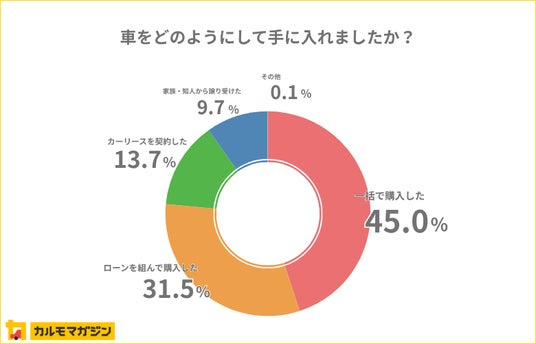 ・車の入手方法は一括購入が45.0%、ローン購入が31.5%、カーリースが13.7%