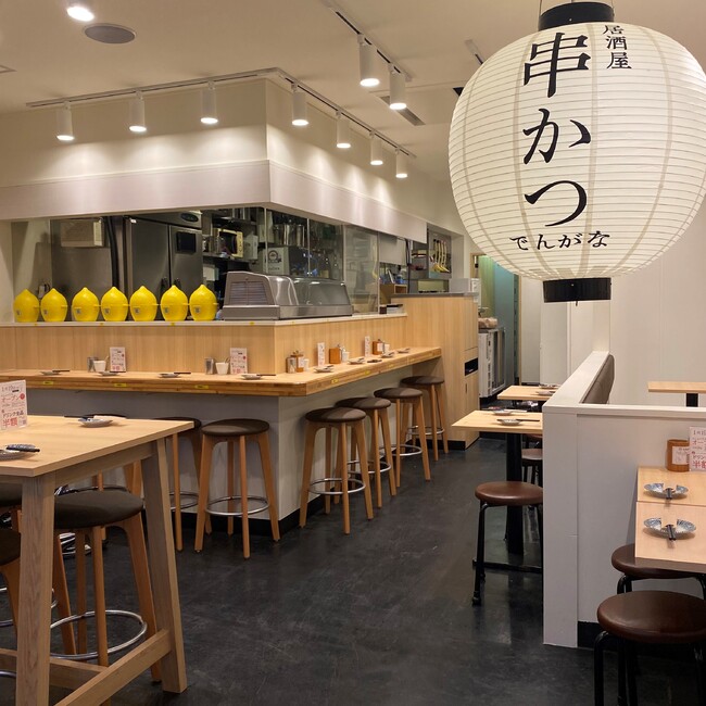 このネオ居酒屋をより多くのお客様にお楽しみいただけるよう、「高円寺店」を1月19日(木)にネオ居酒屋としてリニューアルし、新たにオープンいたします。大きなのれんが目印の「串かつとお酒 でんがな 高円寺店」は、木目を基調とした店内にカウンターやテーブル席が並び、様々な用途でご利用いただけます。