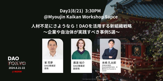 自律分散型組織「DAO」のコンサルティング・実務支援を提供する株式会社ガイアックス(本社:東京都千代田区、代表執行役社長:上田 祐司、証券コード:3775、以下 ガイアックス)は、8月21日(水)に、神田明神で開催される「DAO TOKYO 2024」にてセッション登壇&ブース出展します。