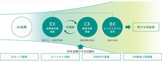 DXビジョンに基づき、働きがいを実感する従業員による質の高いサービスが、お客さまの感動体験を生み、さらに従業員のモチベーションを向上させるようなEXとCXの好循環につなげていきます。積極的なAI活用を起点としたこのサイクルを、グループ連携やパートナー共創、DX推進を支える基盤の強化によって加速させ、ビジネスモデル変革とその先の新たな収益源の獲得を実現することがDXによる価値創造を考えております。