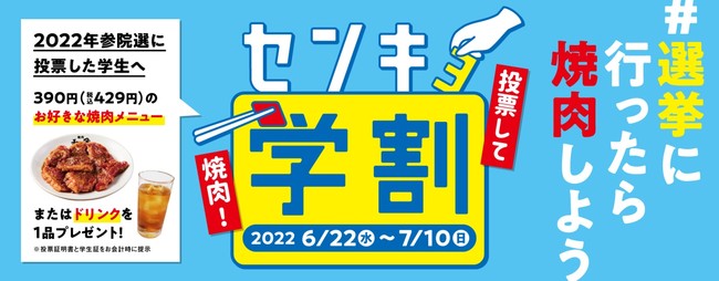 【内容】 2022年参院選に投票した学生を対象に、390円(税込429円)以下のお好きな焼肉メニューまたはドリンクを1品プレゼント。ドリンクバーも含む。